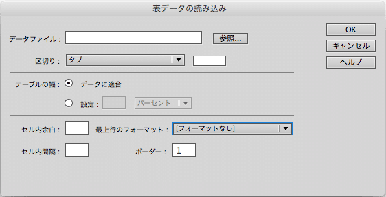 保存したらDreamweaverのメニュー「ファイル → 読み込み → 表データ」を開きます。